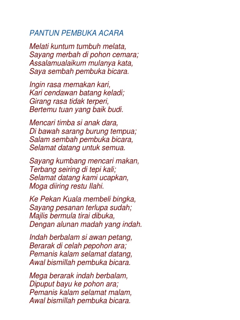 Pantun Pembuka Acara Pembukaan menjadi suatu hal yang cukup krusial dalam suatu acara. Badan kekar umurnya tuaBawa pedang bukanlah petaniApa kabar hadirin semuaSelamat datang di. So you can keep the files where youd like.